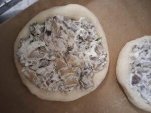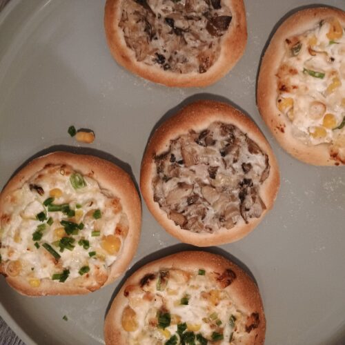 - Kleine Pizzen formen mit etwas erhöhtem Rand. Belegen.