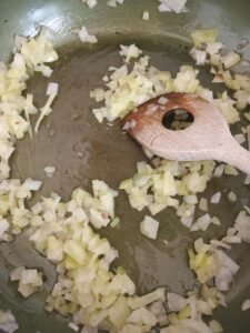 - Die klein geschnittenen Zwiebeln in Olivenöl anschwitzen. Wenn sie glasig sind, den Knoblauch, Thymian und die Pilze hinzugeben.