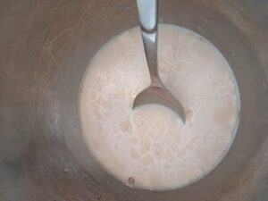 - Nun die Hefemischung mit den restlichen Zutaten vermengen. Mit einer Knetmaschine (alternativ: von Hand) zu einem homogenen Teig verkneten.