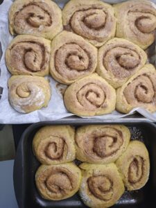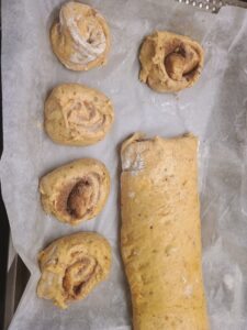 - Ca. 12 Zimtrollen schneiden unda) eine halbe Stunde abgedeckt ruhen lassenoderb) Übernacht in den Kühlschrank (dann am nächsten Morgen etwa 40 Minuten wieder Raumtemperatur annehmen lassen vor dem Backen)