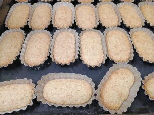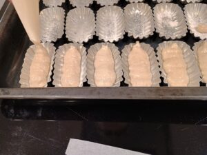 - Die Masse mit einem Spritzbeutel auf ein Blech mit Backpapier in die gewünschte Form spritzen (oder in die Förmchen geben). Die Masse wird im Ofen an Volumen gewinnen, deshalb entsprechend Platz lassen.