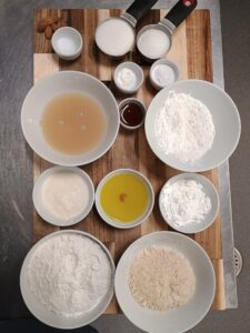 - Die trockenen Zutaten vermischen: Mehle, Stärke, Backpulver und Salz. Anschließend vorsichtig zur Aquafaba-Masse geben. Nicht übermischen!