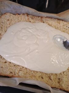 - Wenn der Teig abgekühlt ist, mittig aufschneiden.