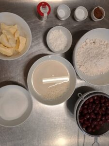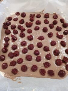 - Die abgetropften Kirschen auf dem Kakaoteig gleichmäßig verteilen.