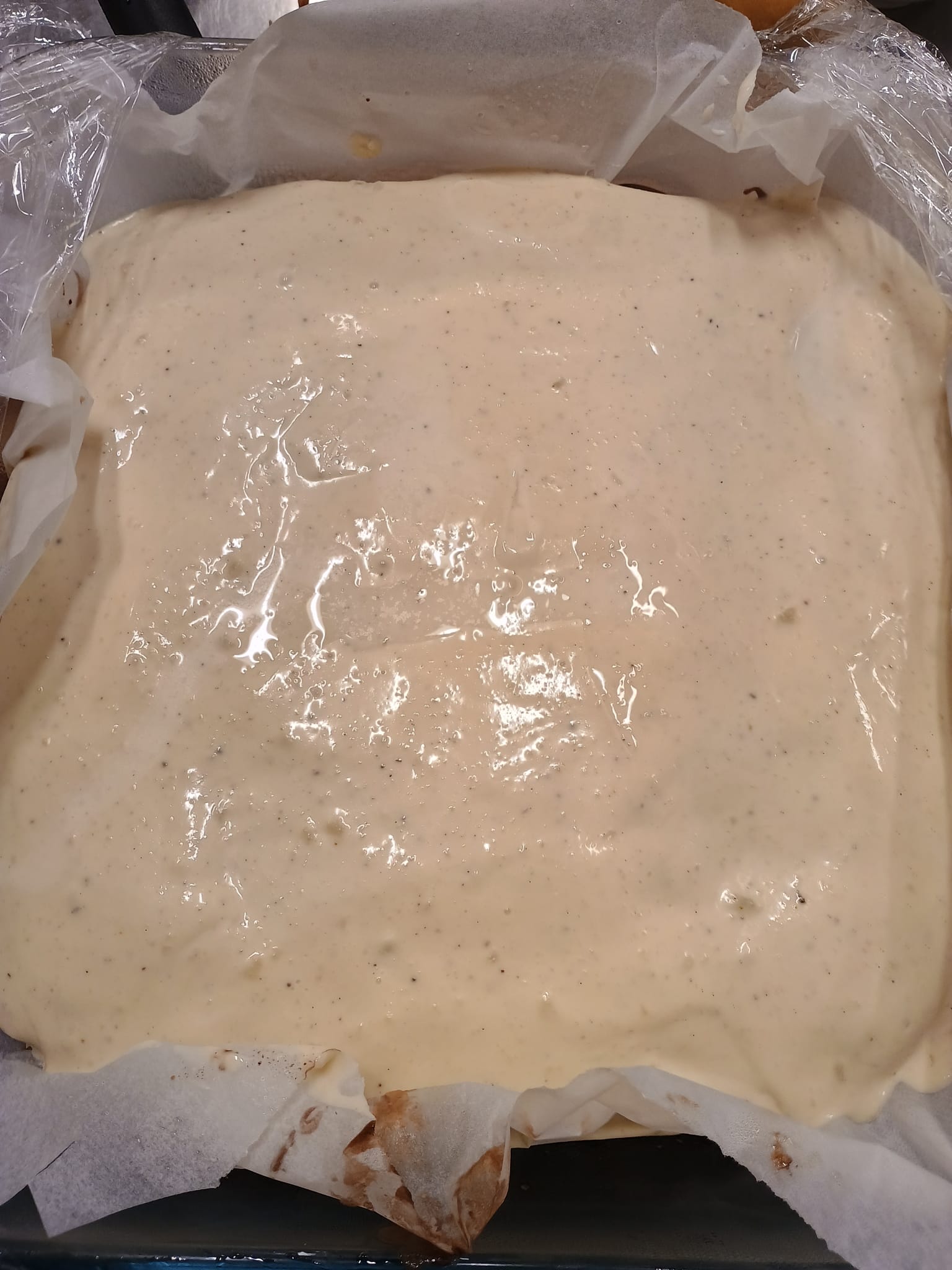 - Die Creme auf dem abgekühlten Teig verteilen und glatt streichen. Den Kuchen im Kühlschrank kalt stellen (gerne über Nacht).
