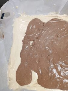 - Die zweite Teig-Hälfte mit Kakao und der warmen Milch vermengen. Über den ersten Teig in der Form glatt verstreichen.
