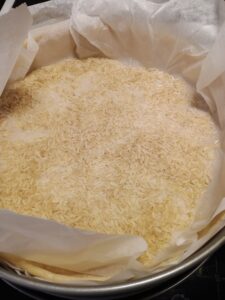 - Teig in die runde Backform geben und einen Rand bis zur Hälfte der Form hochziehen.