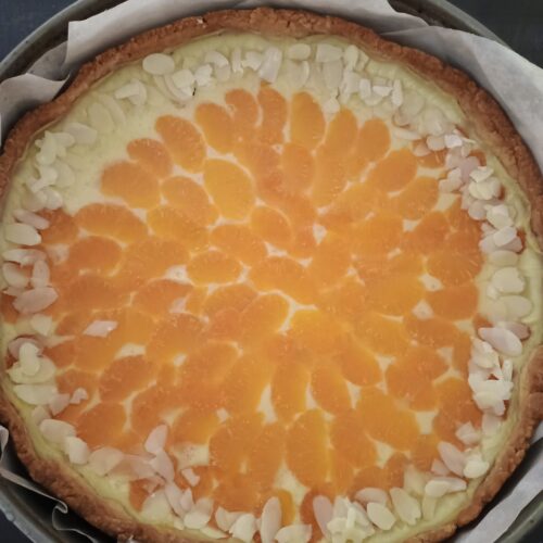 Zarte Mürbeteigtorte, gefüllt mit einer cremigen Vanillepudding-Schmand-Creme, gekrönt von fruchtigen Mandarinen und Mandelblättchen – ein perfektes Zusammenspiel aus frisch, cremig und knackig.